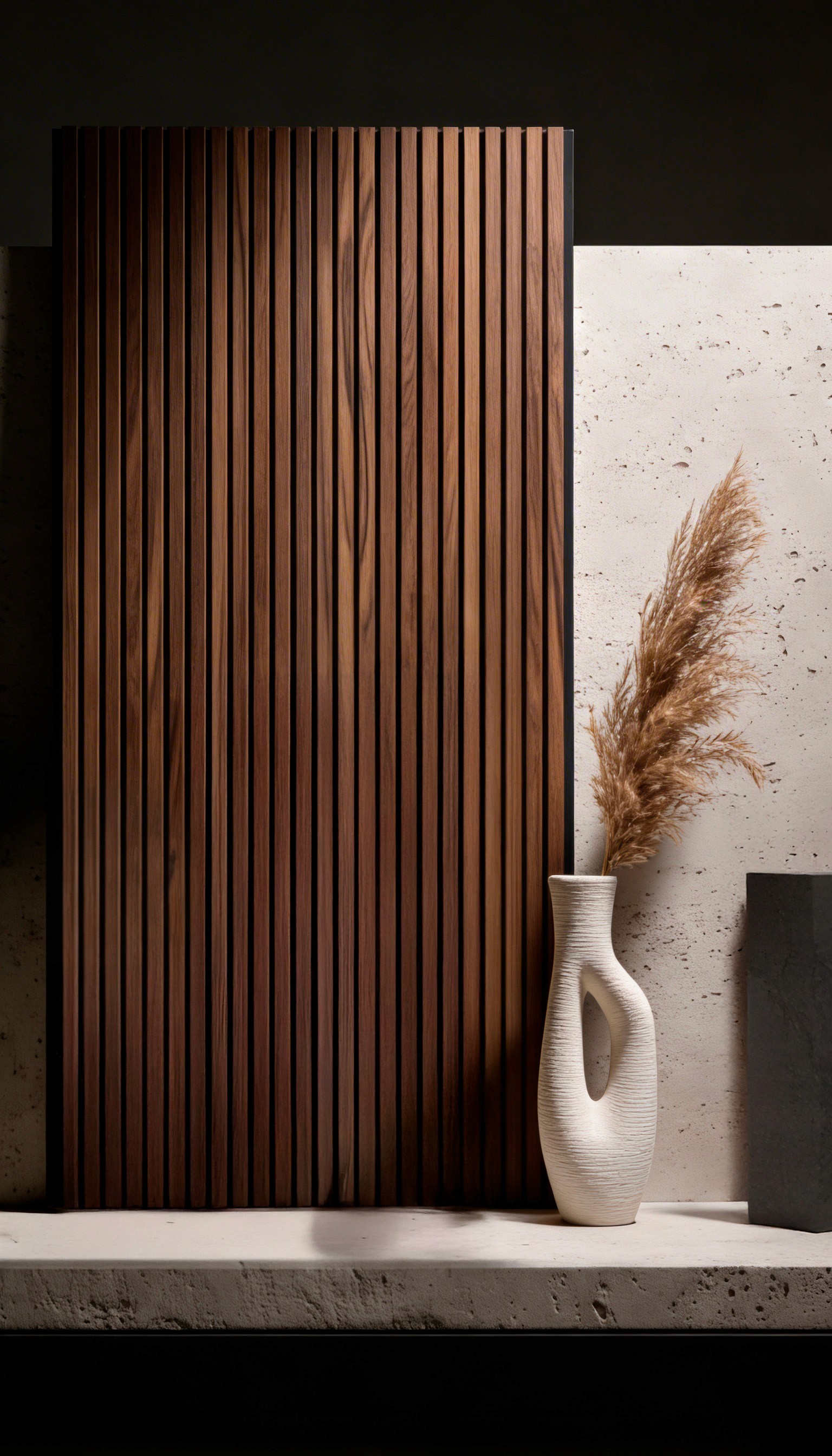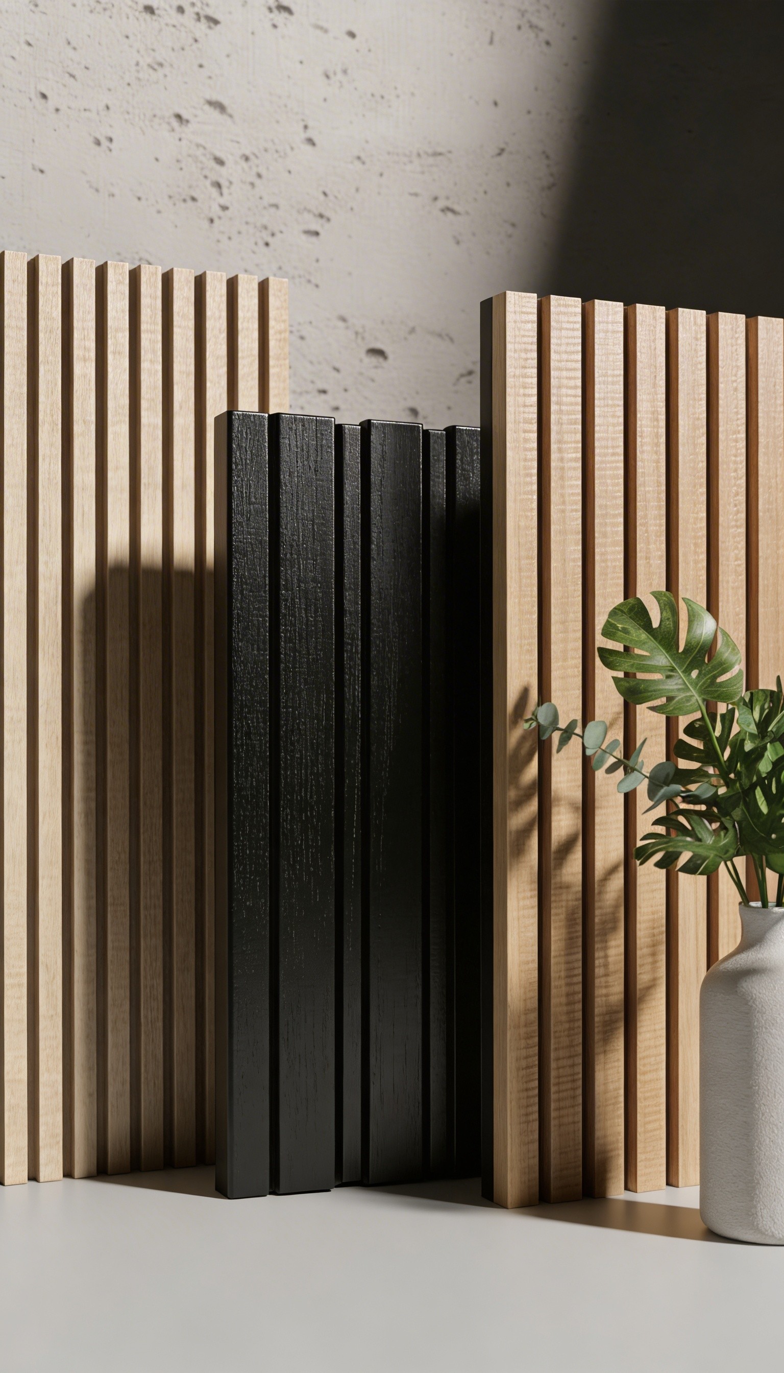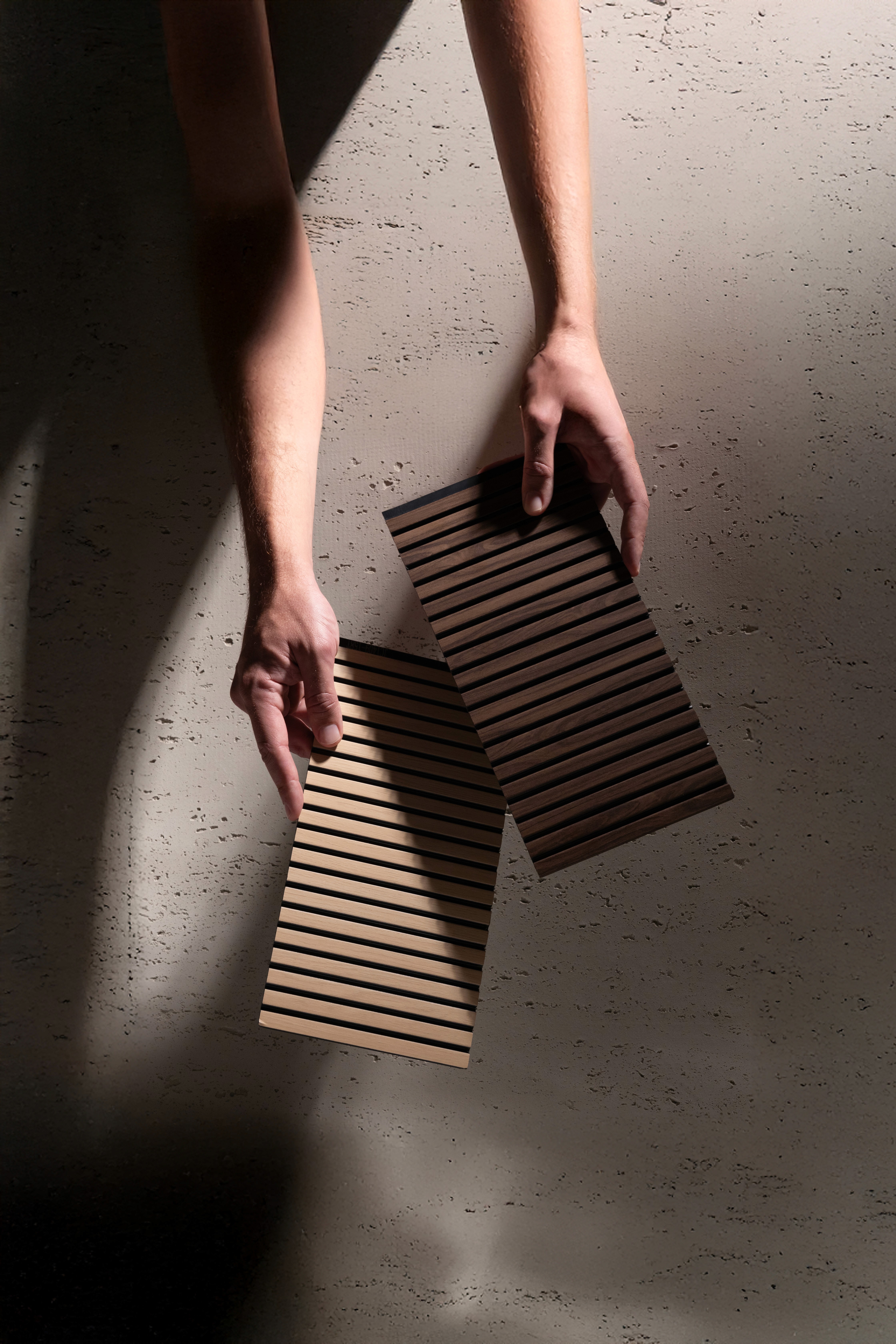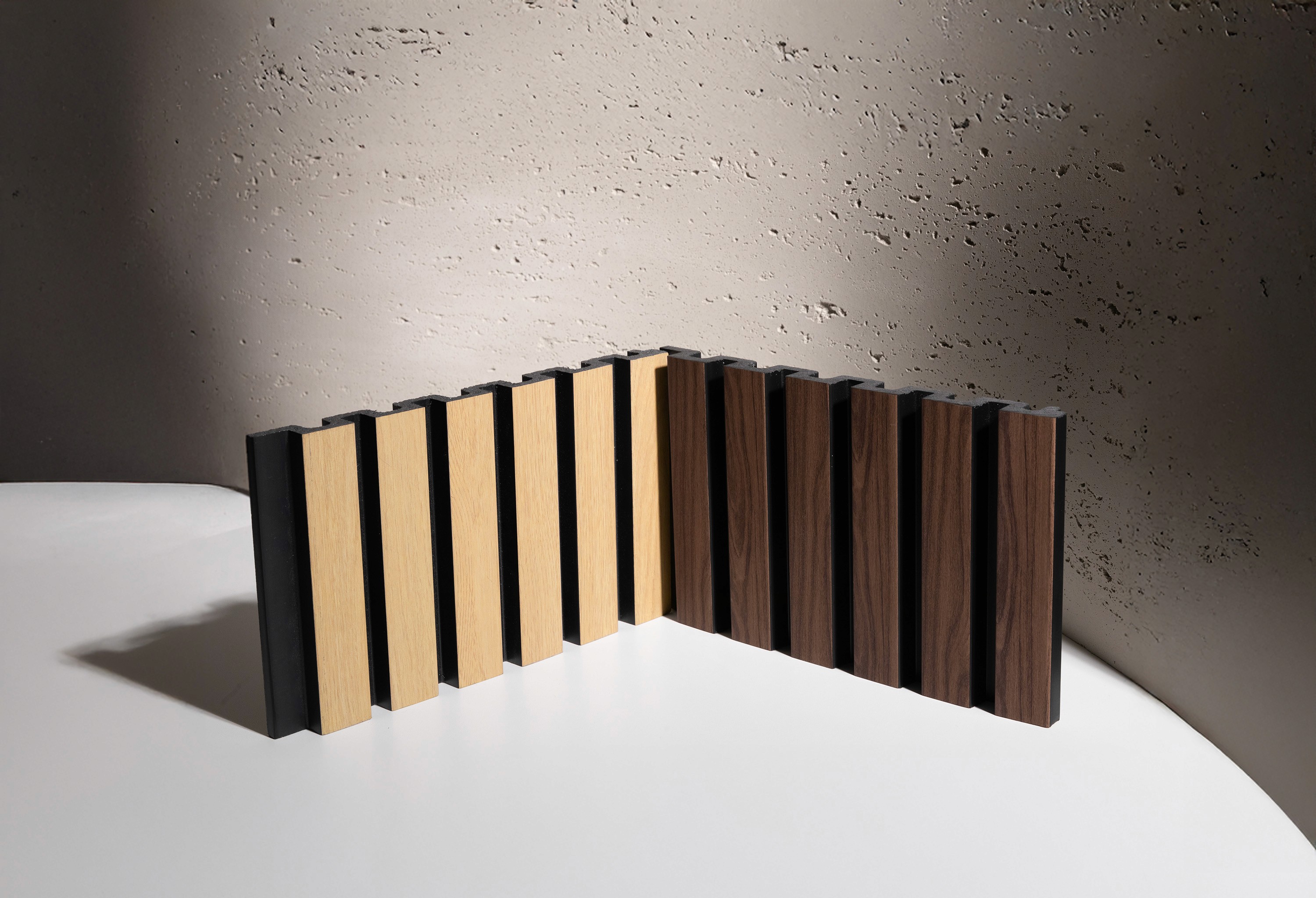 Os painéis ripados Slim e Bold exploram a repetição como linguagem, variando proporção e presença para atender distintas propostas de projeto.